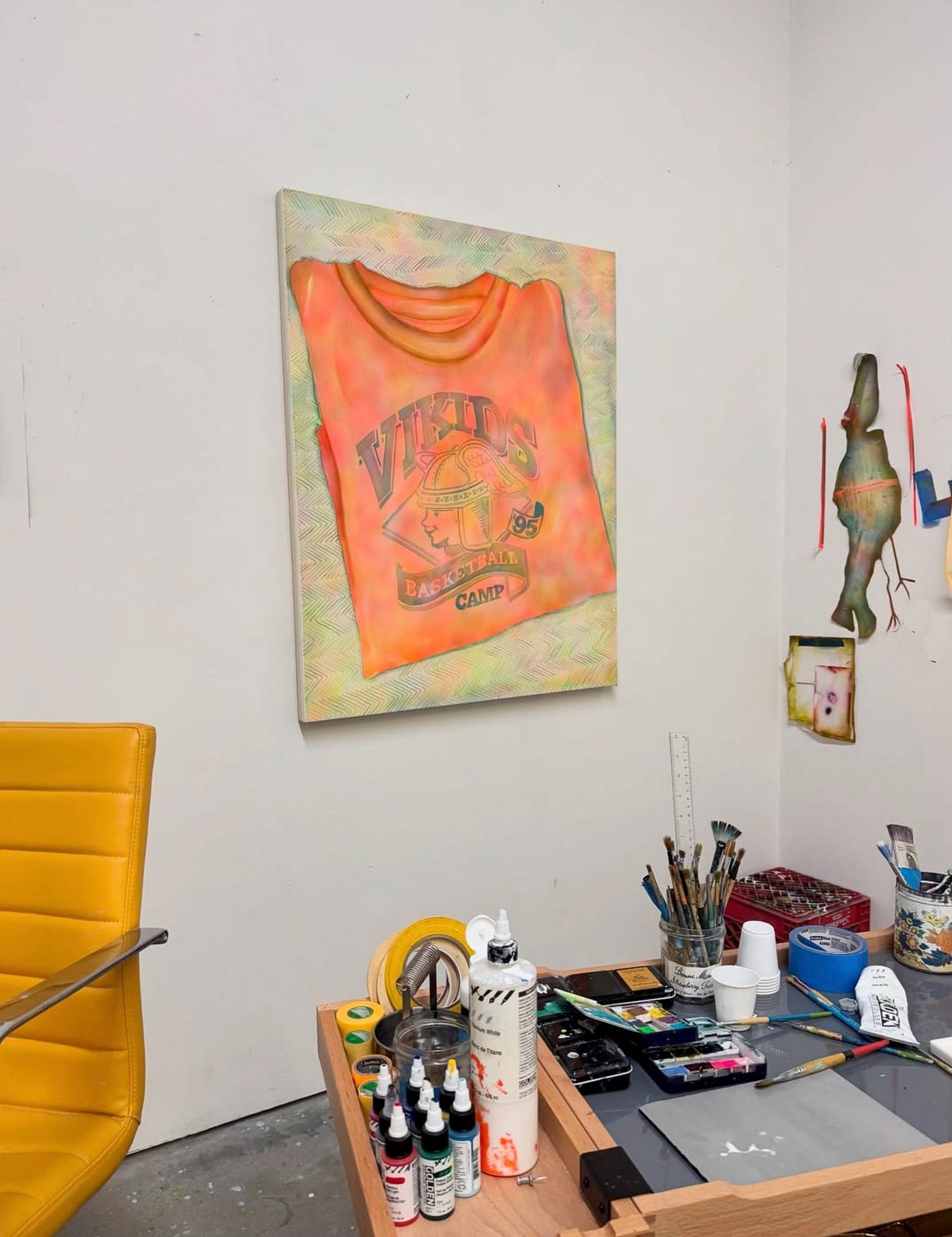 MPM: There’s such a clear visual language in your work, especially with the way you use a recurring vocabulary of domestic spaces and personal possessions like sketchbooks, sneakers, and art materials that really invite the viewer into a private world. Do you see these pieces as ‘portraits’ of yourself? I’m curious if you find that painting your environment actually captures your internal world more authentically than a standard self-portrait?