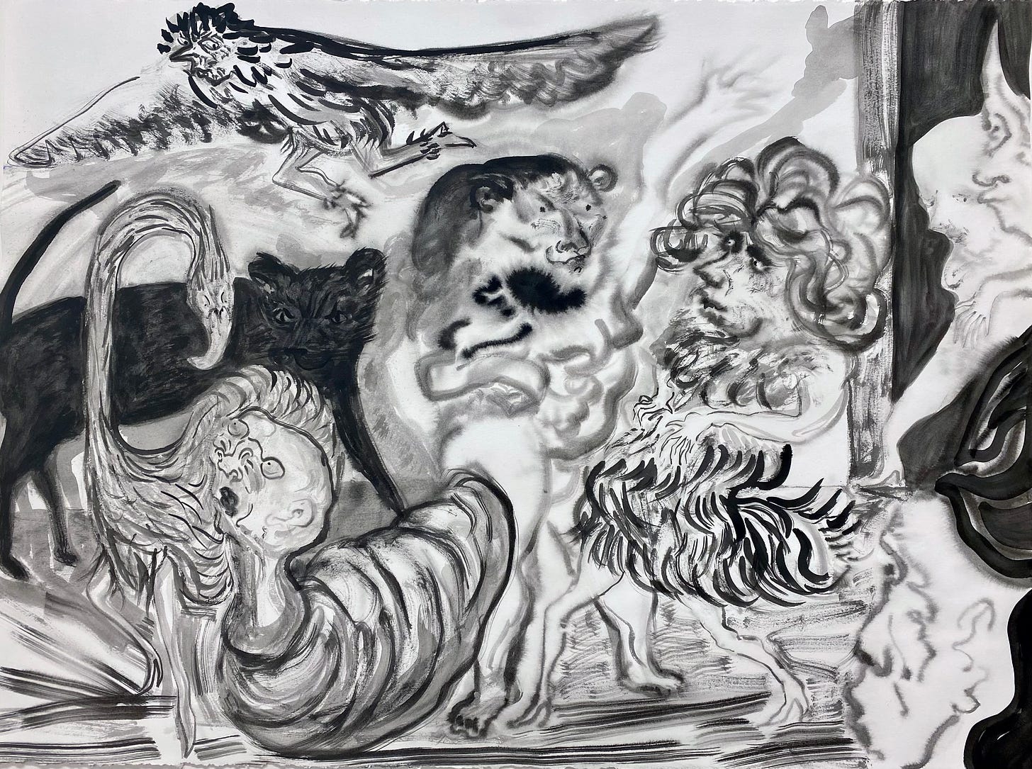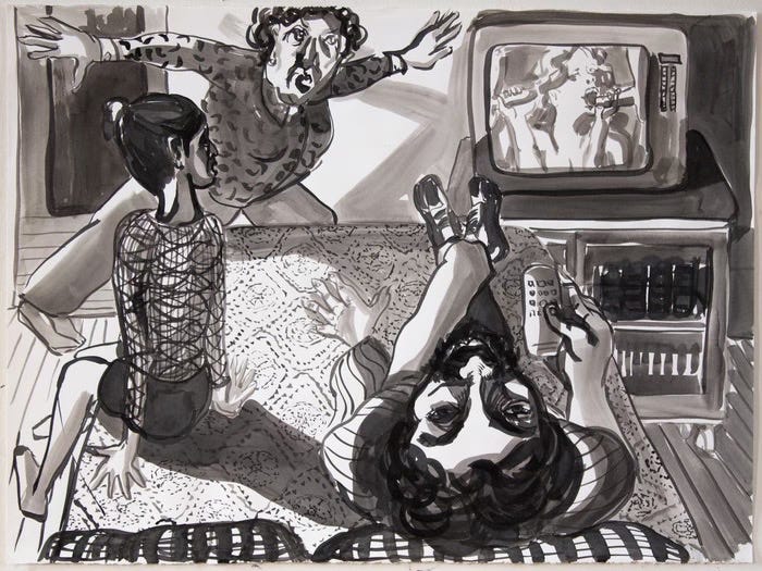 The first drawings I made for this series came out of frustration with oil painting. I think frustration can be a great creative force, often underappreciated. I was struggling with a painting, trying to figure out a composition for a Sunday family gathering scene that I wanted to get out of my memory and make into an image. In a moment of defeat, I abandoned the painting I had been working on for days and turned to ink on paper to work much faster—as an exhalation instead of a planned, labor-intensive process, which a painting often demands, at least for me. I drew a scene using ink on paper in a spontaneous way, without any sketches, rendering a grandmother bringing food to the table while a girlfriend and a daughter compete for the father-figure’s attention: he is the center of everyone’s world; everything revolves around him; three generations of women are trying to please him. While this domestic scene is unfolding, a bird is thrusting itself onto the windowpane, creating a sense of urgency and adding an anxious mood.