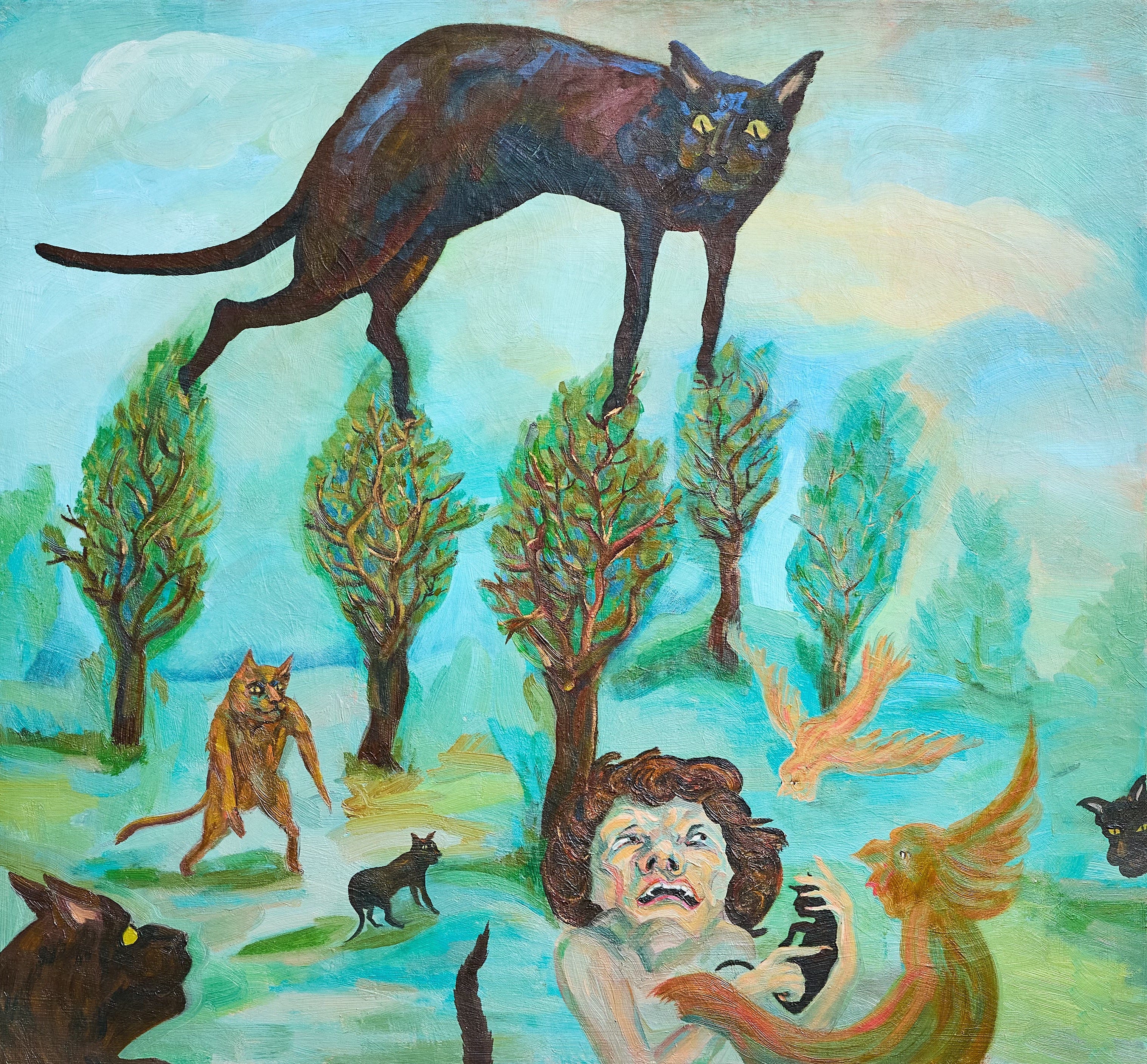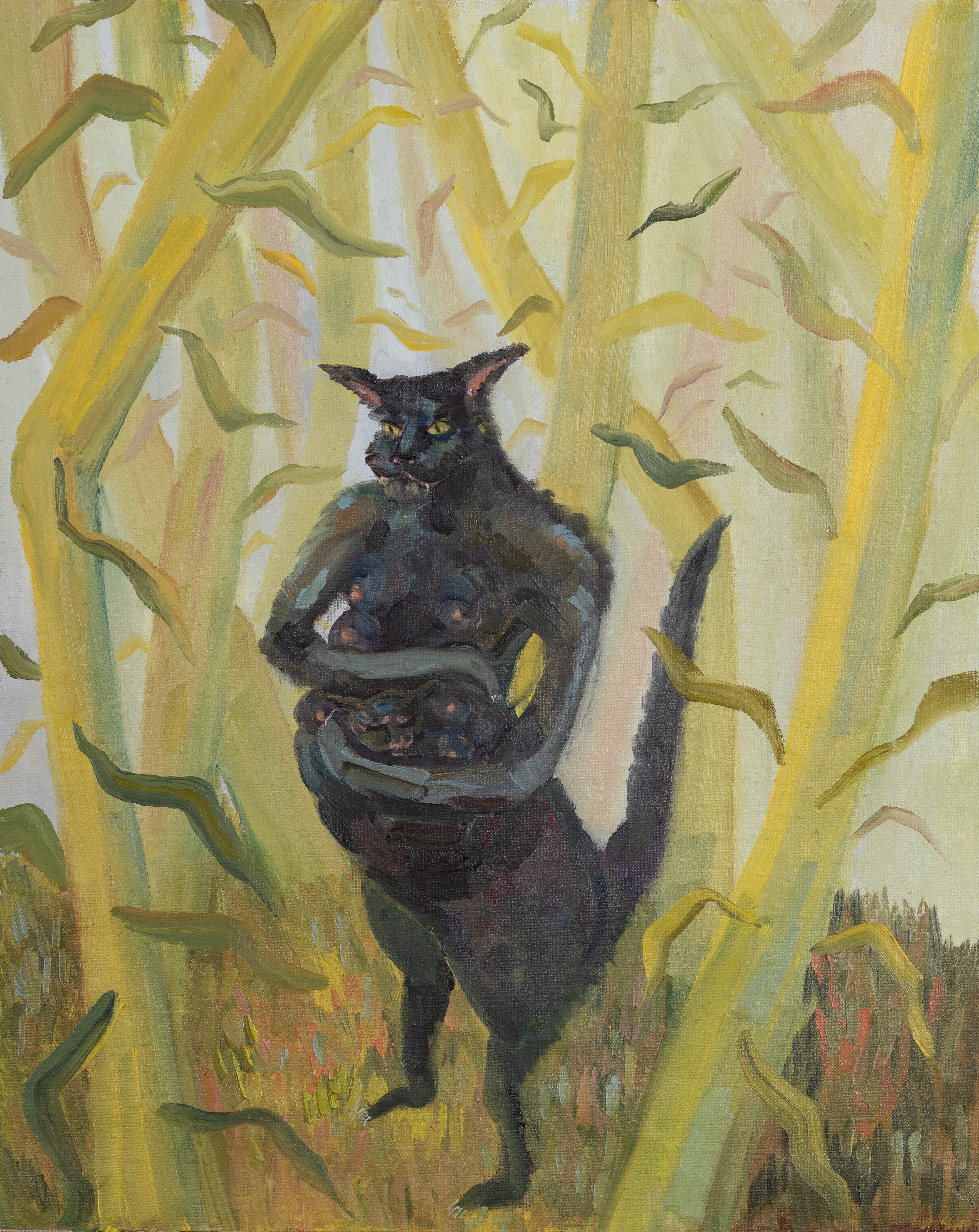 MK: The first painting I made of an anthropomorphized figure is Self-Portrait as a Mother of Pupz. Puppeteer, or Pupz, are some of my cat’s nicknames—his official name is Charlie Korol. He and I are very similar in truly important ways: ways that make up both of our identities, so instead of seeming like a stretch, it seemed appropriate for me to look like him in a painting. He was a street cat, fed and looked after a bit by my neighbors, but in reality he was fending for himself for the first six years of his life. He is a suave, gentlemanly survivor.