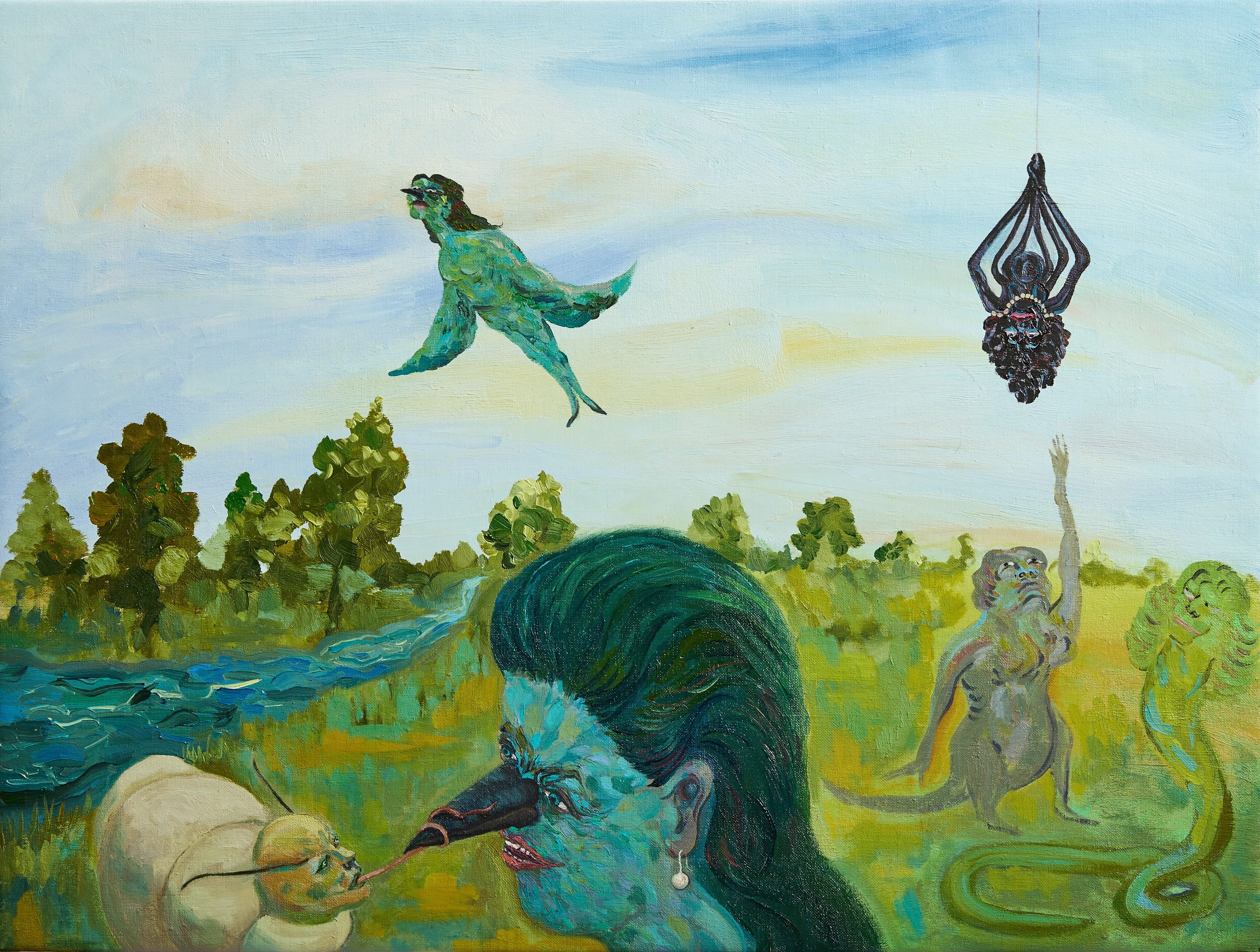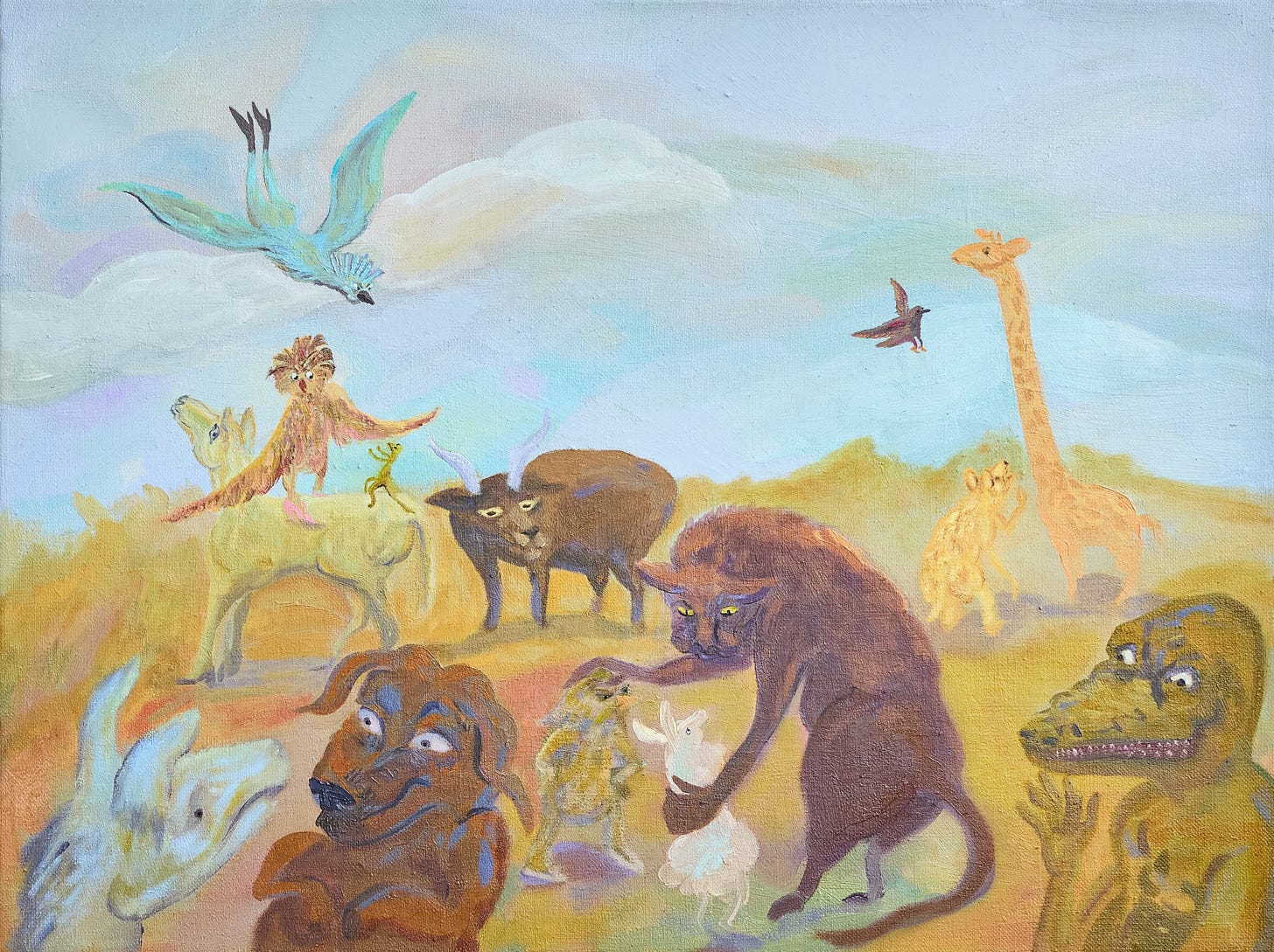 MK: Animals had often featured in my compositions parallel to human figures, but the turn to full-on anthropomorphism started in 2023 when, after about ten years of just drawing, I turned back to oil painting to give it a second chance. I made a series of oil-on-linen paintings while I attended an artist residency named Cobertizo in Jilotepec, about an hour and a half north of Mexico City, in a pastoral setting, with a studio across a pond full of birds and fish. There were also two cows on the grounds and several dogs—Ofelia and Tomás were my favorite ones.