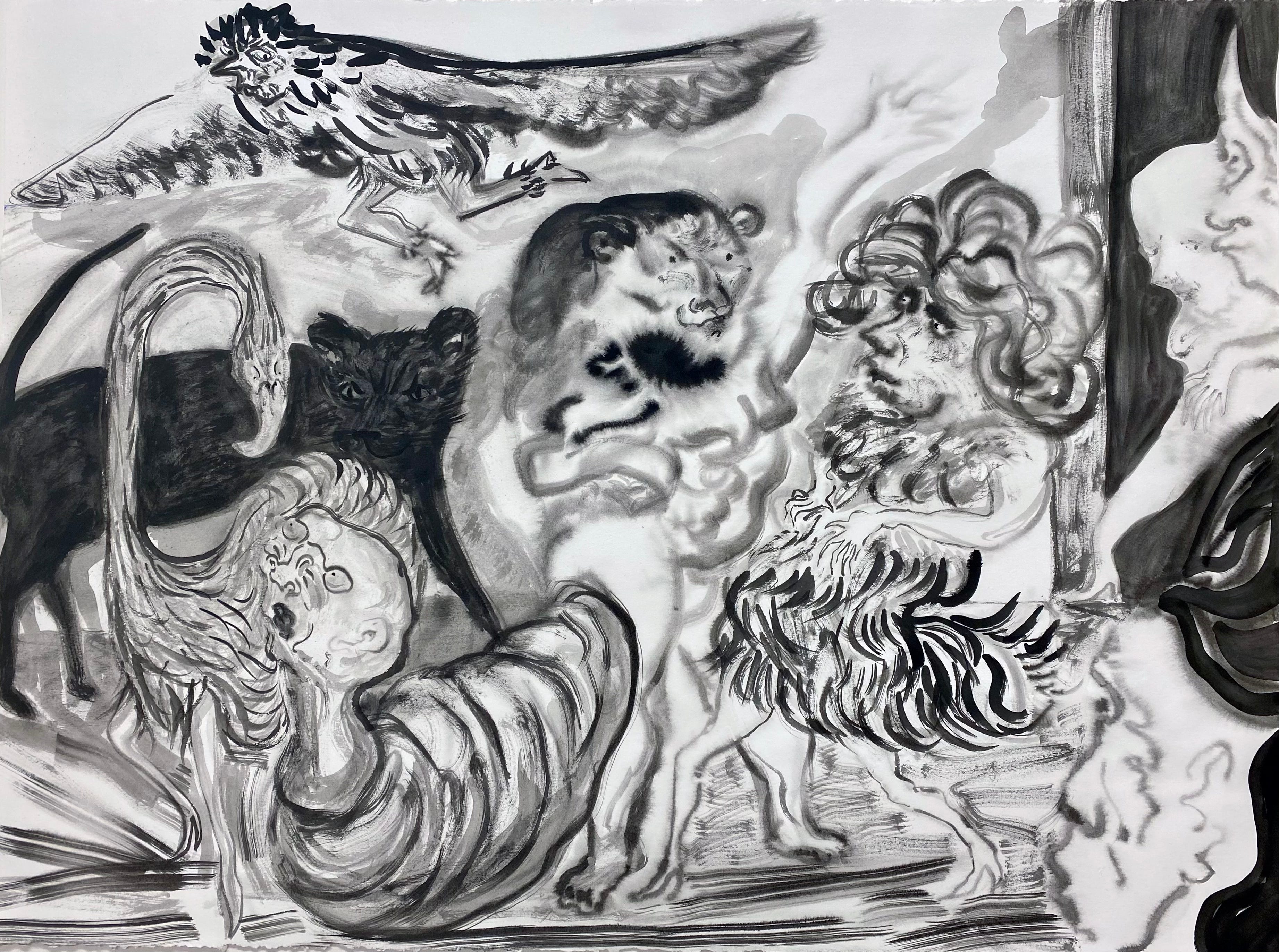 MPM: Over time, your focus shifted from real human situations into more fantasy worlds populated by chimeric and therianthropic figures. Many of these strange creatures feel like they could have stepped straight out of a Bosch painting, yet there’s a playful, almost mischievous humor to them—standing upright, wearing high heels, performing social rituals. What fascinated you about giving animals such clearly human behaviors?