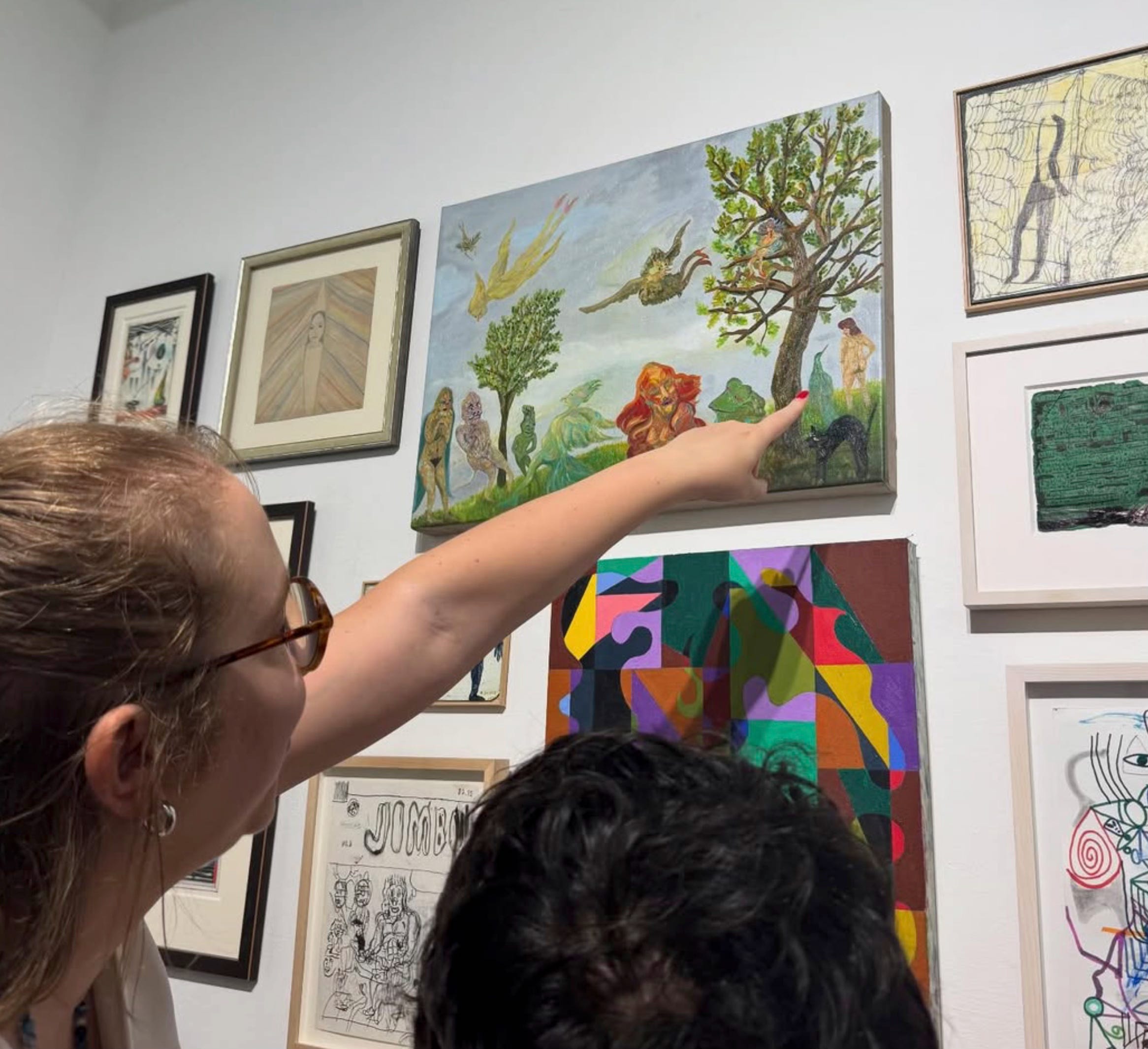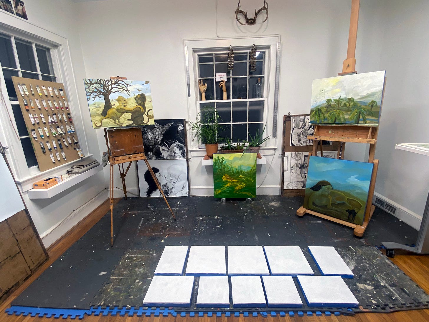 Right before going to this residency, I had visited the Biblioteca Palafoxiana in Puebla, the first library in the Americas. They had two incredible books on display, Arca Noë and Musurgia Universalis, by Athanasius Kircher, a German scholar from the sixteenth century. These two books deal with animals in different ways, each containing incredible fantastical illustrations that, at the time the books were created, people took to be accurate depictions of animal species (I suppose), but they were clearly imagined by Kircher. Seeing these illustrations and being surrounded by nature, the sounds of animals, and my artists’ cohort inspired me to make a series of paintings and drawings I simply titled Bichos, where I mixed fantasy, animals, and human qualities and interactions in a playful way.